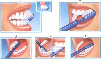 Začína sa na vonkajšej strane zubov tak, že vlákna zubnej kefky priložíte na okraj ďasien zubov, ktoré smerujú a nasadajú v 45-stupňovom uhle. Jedna polovica kefky sa dotýka ďasna, druhá zubov. Kefka najprv len ľahko vibruje, a pritom sa nepohne z miesta, aby povolil zubný povlak, potom sa povlak „zotrie“ od „červeného k bielemu“, čiže od ďasna smerom k hrane zubov (obrázok č. 4.1 a 4.2). Postupujte na vnútornú plochu zubov, ktorú vyčistite rovnako ako vonkajšiu stranu (obrázok č. 4.3). Nezabudnite ani na vnútornú stranu predných zubov, ktoré treba vyčistiť krátkymi pohybmi od ďasien ku korunke zuba (obrázok č. 4.4). Žuvaciu plochu vyčistite jemnými pohybmi dopredu a dozadu (obrázok č. 4.5). Špeciálne treba dbať na oblasť zadných stoličiek a vyčistiť ich zo všetkých strán, čiže všetky ich plochy.